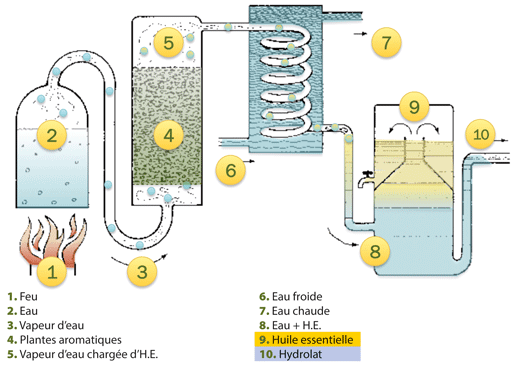 La vapeur d’eau permet d’ouvrir les plantes qui libèrent des molécules aromatiques, la vapeur les retient, passe dans un serpentin (phase de condensation) puis termine dans un essencier. L’huile se sépare de l’eau.